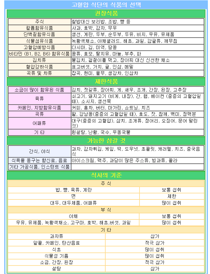 고혈압 환자 식단의 선택, 출처 : 영양사도우미