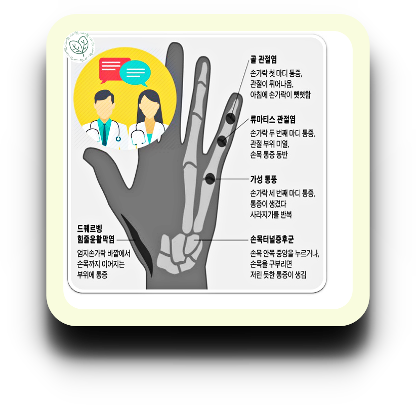 손가락 마디 굵어짐 현상은 다양한 질환에서 나타날 수 있습니다. 이 중 퇴행성관절염은 손가락 통증으로 병원을 찾는 사람들 중 가장 많이 보이는 질환입니다. 이 질환은 손가락 관절을 과도하게 사용해 연골에 염증이 생기는 질환으로, 손을 자주 쓰는 사람들에게 흔히 발생합니다. 또한 방아쇠수지, 드퀘르벵 건염, 류마티스관절염, 통풍 등의 질환도 손가락 마디 굵어짐 현상을 동반할 수 있습니다.