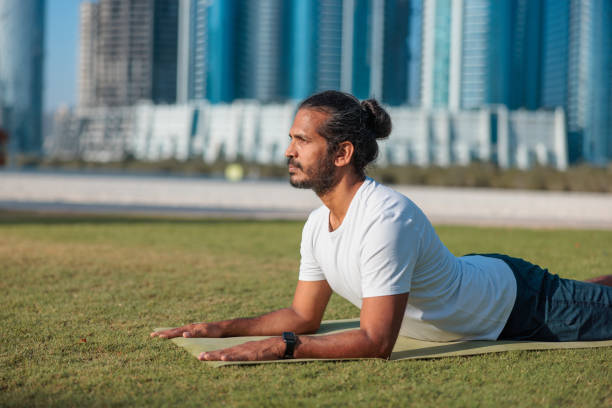 엎드려 누운 후 손을 어깨 아래에 놓고 상체를 들어 올리는 코브라 자세는 허리 근육을 강화하고 척추를 뒤로 굽히는데 도움이 됨.